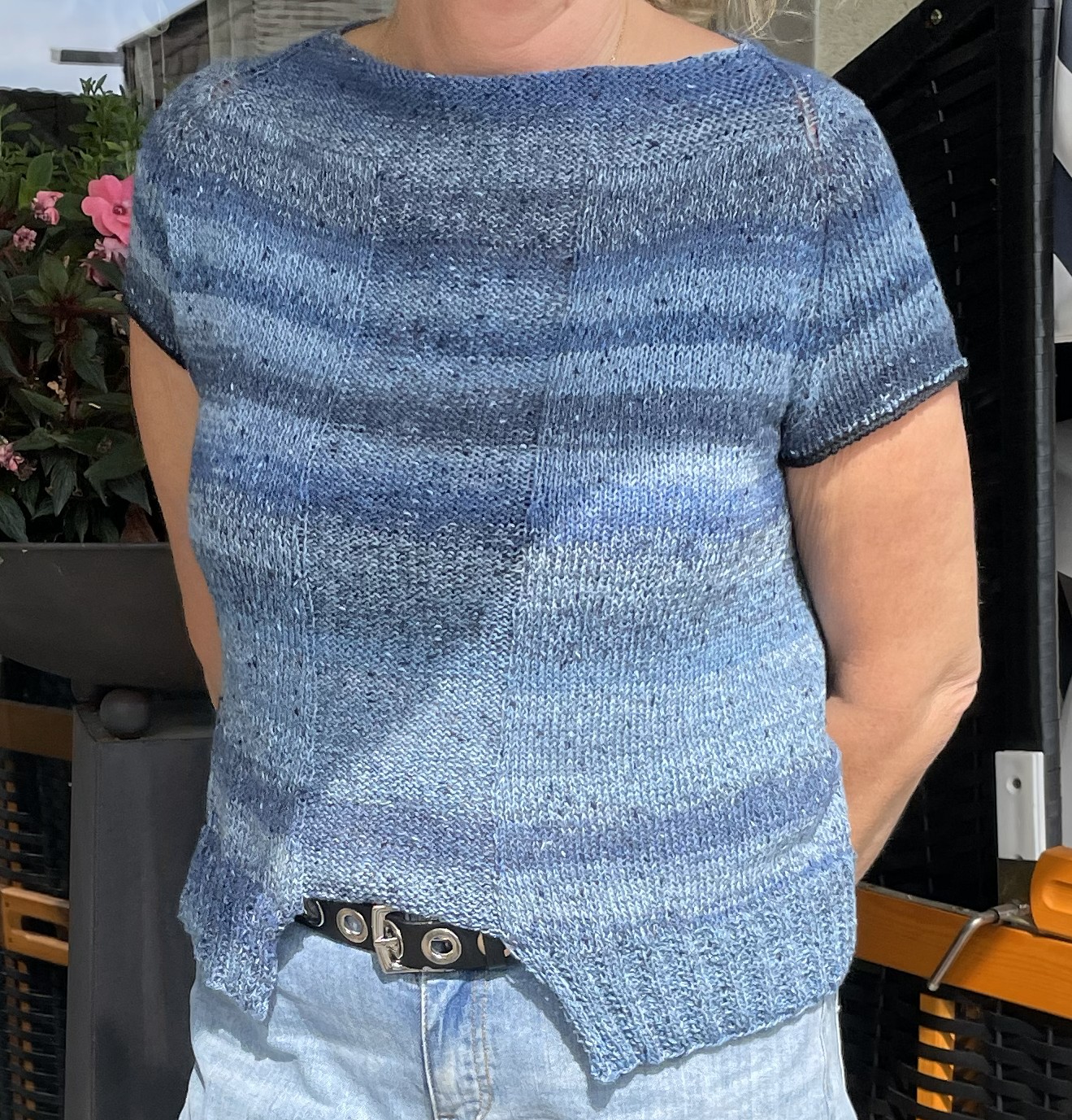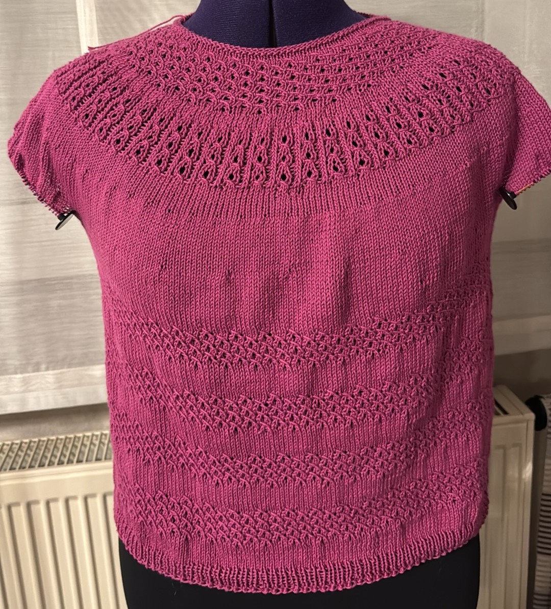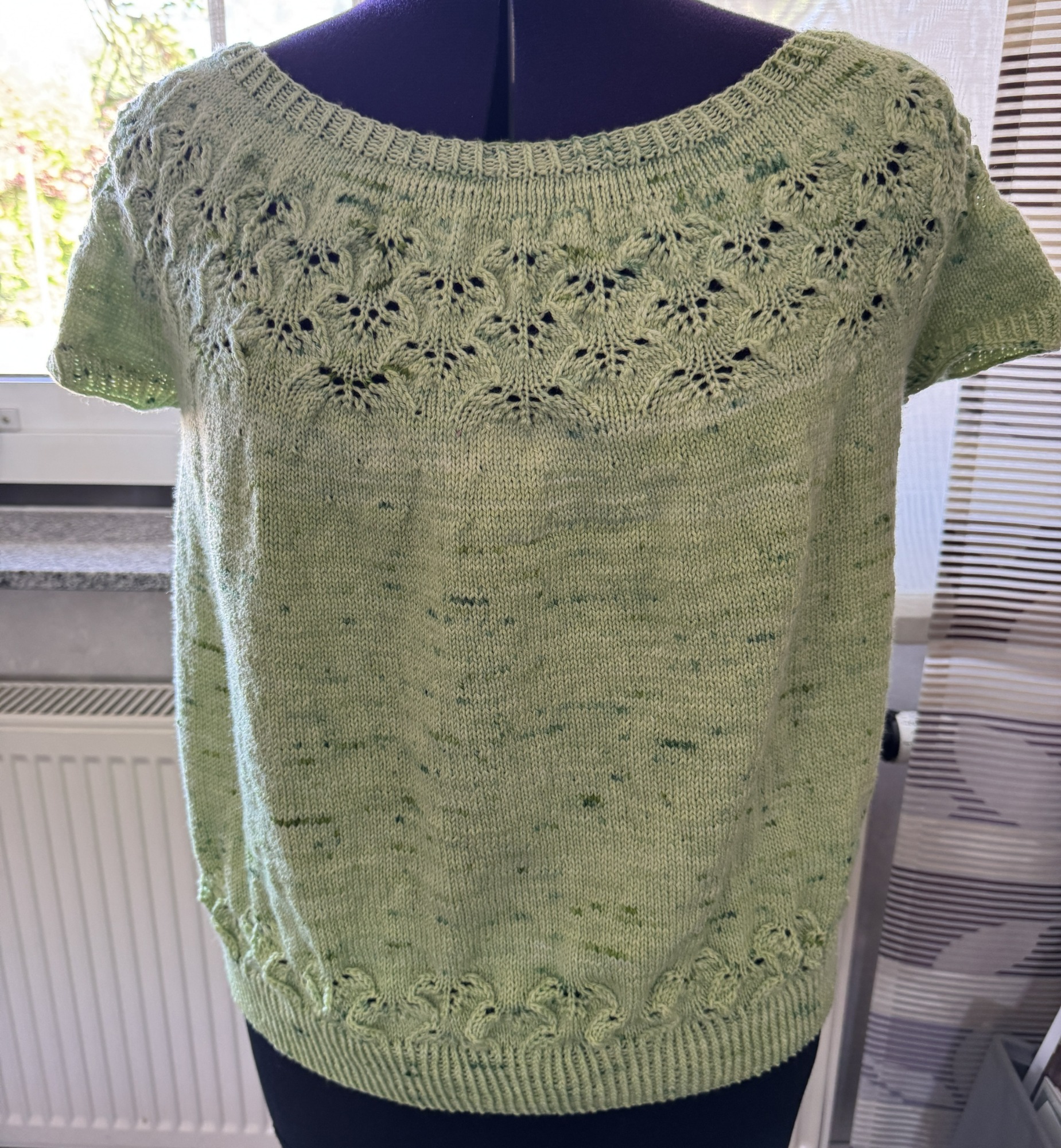 nach der Anleitung von Rosarios4 aus einem Baumwoll-Seidengarn. Das seitliche Ajourmuster hat sehr viel Spaß gemacht.
